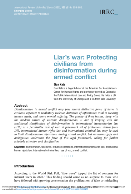 "Disinformation in armed conflict may pose several distinctive forms of harm to civilians: exposure to retaliatory violence, distortion of information vital to securing human needs, and severe mental suffering. The gravity of these harms, along with the modern nature of wartime disinformation, is out of keeping with the traditional classification of disinformation in international humanitarian law (IHL) as a permissible ruse of war. A patchwork set of protections drawn from IHL, international human rights law and international criminal law may be used to limit disinformation operations during armed conflict, but numerous gaps and ambiguities undermine the force of this legal framework, calling for further scholarly attention and clarification." (Abstract)
