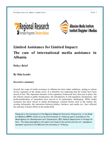 "Overall, the scope of media assistance in Albania has been rather ambitious, aiming to reform all key segments of the media sector. It is therefore not surprising that the results have been mixed at best. The important elements of the regulatory framework have been put in place, but the reforms aimed at public broadcasters, the introduction of self-regulatory mechanisms, and professionalization of journalism have proved to be particularly challenging. While media assistance has been crucial in media development, external factors such as the market, the existing informality, the interaction between politics, business, and media, etc., have affected the outcome of donor efforts in the media field." (Summary)