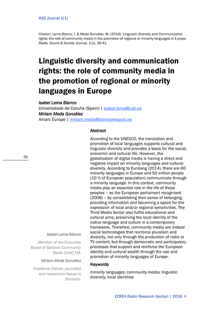 "According to Eurolang (2014), there are 60 minority languages in Europe and 50 million people (10 % of European population) communicate through a minority language. In this context, community media play an essential role in the life of these peoples – as the European parliament recognised (2008) – by consolidating their sense of belonging, providing information and becoming a space for the expression of local and/or regional sensitivities. The Third Media Sector also fulfils educational and cultural aims, preserving the local identity of the native language and culture in a contemporary framework. Therefore, community media are indeed social technologies that reinforce pluralism and diversity, not only through the production of radio or TV content, but through democratic and participatory processes that support and reinforce the European identity and cultural wealth through the use and promotion of minority languages of Europe." (Abstract)