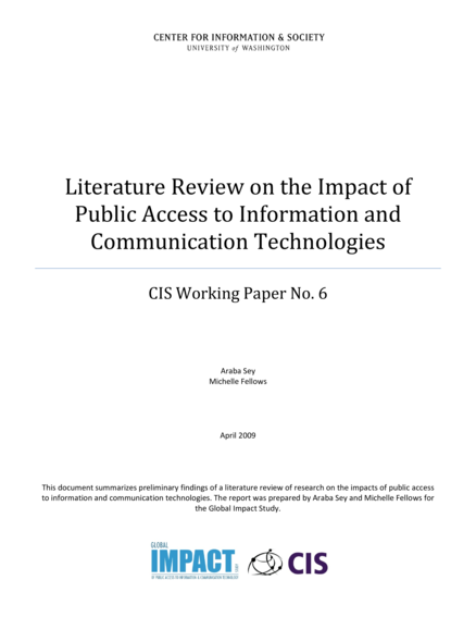 "This report presents a review of empirical research on the impacts of public access to ICTs in order to document what is known about this approach to ICT service delivery. The results show that there is limited conclusive evidence on downstream impacts of public access to ICTs. The evidence that does exist suggests that the public access ICT model is not living up to the expectations placed on it. This is not necessarily because public access has had no impacts, but because its impact is particularly difficult to identify and measure. As a model, public access to ICTs has experienced success and failure, leading to both reinforcement of the belief that the model should be expanded and strengthened; as well as claims that public access ICTs are ultimately ineffective or even counter-productive from the development perspective. Four main types of evidence are identified: evidence on venue performance and sustainability, users, usage patterns and downstream impacts. Assessment of this evidence indicates that trends are most apparent in the first three areas, while evidence of downstream impacts remains elusive. Most studies show that sustainability is a critical challenge especially in low resource, low income environments where commercial services are not viable. They also show that users are primarily young males with relatively high socio-economic statusand prior access to the Internet. Users tend to engage in social and personal activities as opposed to economic activities, for example. Findings on downstream impacts fall on both sides of the equation, some studies conclude that impacts are high in a variety of areas, development of ICT skills, job creation, civic engagement etc; others find limited impacts." (Abstract)