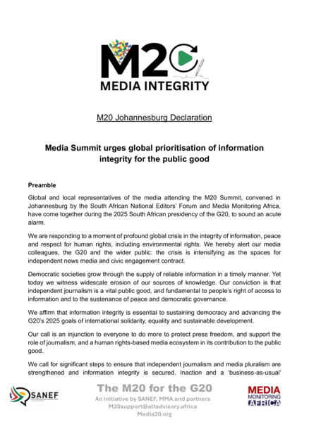 "The M20 is a parallel independent initiative to the G20. As a broad alliance, we have come together to promote journalism as a public good, as a key to information integrity and G20 goals. To this end, M20 participants have compiled a set of policy briefs and convened in Johannesburg on 1-2 September, 2025 to build consensus and a common voice around broad fundamentals. These steps follow previous media initiatives during G20 processes hosted in Brazil (2024) and India (2023). The official G20 baton is to be handed to the United States in 2026. This M20 Declaration is a result of a collaborative global discussion and a foundation for further information-sharing to ensure that the G20 integrates information integrity, press freedom and media sustainability into a broader development financing architecture. This Declaration builds on and supports existing global frameworks, including the Windhoek Declaration of 1991 on a Free, Pluralistic and Independent African media, and the Windhoek+30 Declaration of 2021 on Information as a Public Good. It is aligned to the UN’s Global Principles for Information Integrity, which recognise an independent, free and pluralistic media as one of five pillars. It welcomes the focus on information Integrity in the G20 2024 Digital Economy Working Group Maceio Ministerial Declaration, and encourages the 2025 G20 to continue giving attention to this priority subject." (Page 2)