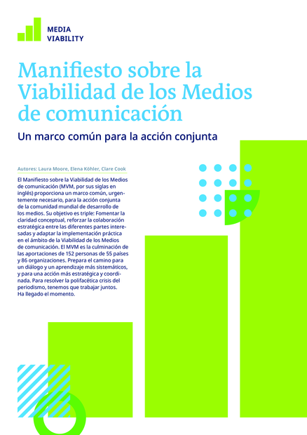 "El Manifiesto sobre la Viabilidad de los Medios de comunicación (MVM, por sus siglas en inglés) proporciona un marco común, urgentemente necesario, para la acción conjunta de la comunidad mundial de desarrollo de los medios. Su objetivo es triple: fomentar la claridad conceptual, reforzar la colaboración estratégica entre las diferentes partes interesadas y adaptar la implementación práctica en el ámbito de la Viabilidad de los Medios de comunicación. El MVM es la culminación de las aportaciones de 152 personas de 55 países y 86 organizaciones. Prepara el camino para un diálogo y un aprendizaje más sistemáticos, y para una acción más estratégica y coordinada. Para resolver la polifacética crisis del periodismo, tenemos que trabajar juntos." (Página 1)