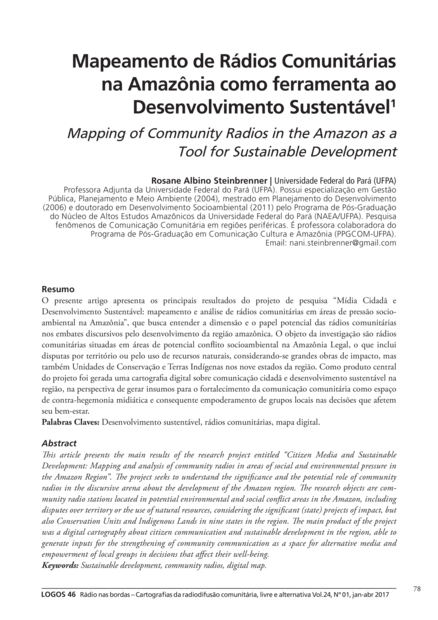 "O presente artigo apresenta os principais resultados do projeto de pesquisa “Mídia Cidadã e Desenvolvimento Sustentável: mapeamento e análise de rádios comunitárias em áreas de pressão socioambiental na Amazônia”, que busca entender a dimensão e o papel potencial das rádios comunitárias nos embates discursivos pelo desenvolvimento da região amazônica. O objeto da investigação são rádios comunitárias situadas em áreas de potencial conflito socioambiental na Amazônia Legal, o que inclui disputas por território ou pelo uso de recursos naturais, considerando-se grandes obras de impacto, mas também Unidades de Conservação e Terras Indígenas nos nove estados da região. Como produto central do projeto foi gerada uma cartografia digital sobre comunicação cidadã e desenvolvimento sustentável na região, na perspectiva de gerar insumos para o fortalecimento da comunicação comunitária como espaço de contra-hegemonia midiática e consequente empoderamento de grupos locais nas decisões que afetem seu bem-estar." (Resumo)