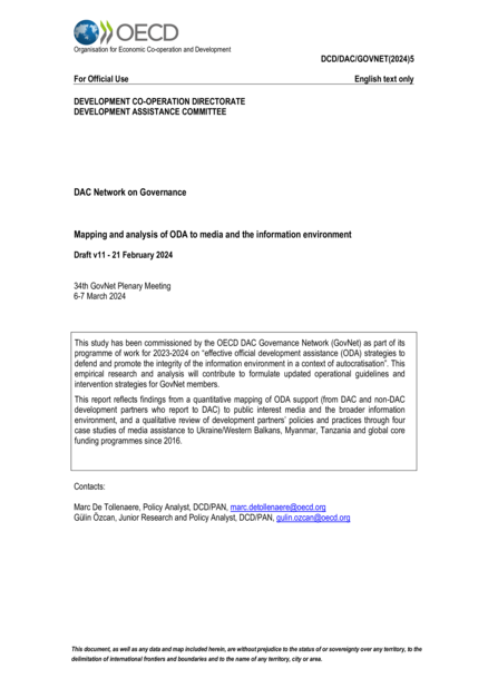 "Laure-Hélène Piron (The Policy Practice Director) undertook an analysis of official development assistance to media and the information environment for the Governance Network of the OECD Development Assistance Committee which was published in June 2024. The report shows that the rhetoric of governments which support freedom of expression and condemn disinformation is not matched by sufficient resources. ODA for media and the information environment has increased since 2002, reaching USD 1.5 billion in 2022, but this only represented 0.5% of total ODA in that year. When infrastructure support is excluded, ODA for media fluctuated around USD 500 million a year since 2008 (representing 0.19% of total ODA in 2022). This is despite the growth of threats facing media, such as the rise of censorship and the dominance of technology platforms.