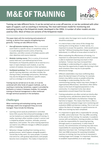 "Training can take different forms. It can be carried out as a one-off exercise, or can be combined with other types of support, such as coaching or mentoring. The most well-known model for monitoring and evaluating training is the Kirkpatrick model, developed in the 1950s. A number of other models are also used by CSOs. Most of these are variants of the Kirkpatrick model." (Introduction)
