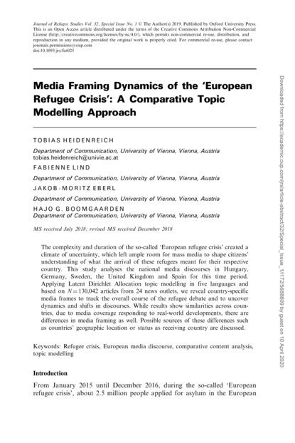"The complexity and duration of the so-called ‘European refugee crisis’ created a climate of uncertainty, which left ample room for mass media to shape citizens’ understanding of what the arrival of these refugees meant for their respective country. This study analyses the national media discourses in Hungary, Germany, Sweden, the United Kingdom and Spain for this time period. Applying Latent Dirichlet Allocation topic modelling in five languages and based on N=130,042 articles from 24 news outlets, we reveal country-specific media frames to track the overall course of the refugee debate and to uncover dynamics and shifts in discourses. While results show similarities across countries, due to media coverage responding to real-world developments, there are differences in media framing as well. Possible sources of these differences such as countries’ geographic location or status as receiving country are discussed." (Abstract)