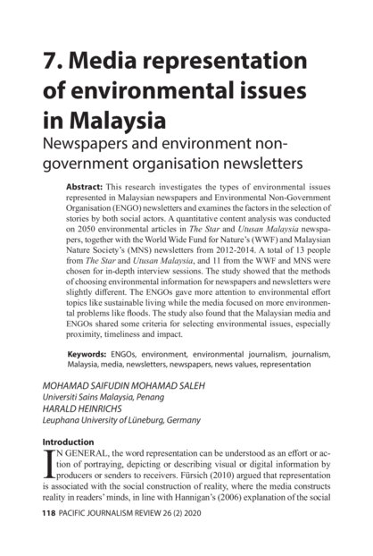 "This research investigates the types of environmental issues represented in Malaysian newspapers and Environmental Non-Government Organisation (ENGO) newsletters and examines the factors in the selection of stories by both social actors. A quantitative content analysis was conducted on 2050 environmental articles in The Star and Utusan Malaysia newspapers, together with the World Wide Fund for Nature’s (WWF) and Malaysian Nature Society’s (MNS) newsletters from 2012-2014. A total of 13 people from The Star and Utusan Malaysia, and 11 from the WWF and MNS were chosen for in-depth interview sessions. The study showed that the methods of choosing environmental information for newspapers and newsletters were slightly different. The ENGOs gave more attention to environmental effort topics like sustainable living while the media focused on more environmental problems like floods. The study also found that the Malaysian media and ENGOs shared some criteria for selecting environmental issues, especially proximity, timeliness and impact." (Abstract)