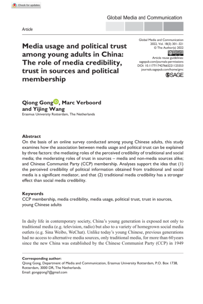 "On the basis of an online survey conducted among young Chinese adults, this study examines how the association between media usage and political trust can be explained by three factors: the mediating roles of the perceived credibility of traditional and social media; the moderating roles of trust in sources – media and non-media sources alike; and Chinese Communist Party (CCP) membership. Analyses support the idea that (1) the perceived credibility of political information obtained from traditional and social media is a significant mediator, and that (2) traditional media credibility has a stronger effect than social media credibility." (Abstract)