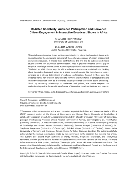 "This article examines what drives audience participation in interactive broadcast shows, with implications for the democratic potential of these shows as spaces of citizen engagement and public discussion. It makes three contributions, the first two to audience and media studies and the last to political communication. First, it provides evidence to fill a gap in empirical knowledge on what drives audience participation in interactive broadcasts in Africa. “Mediated sociability”—the ways in which audience members are socialized into thinking about interactive broadcast shows as a space in which people like them have a voice— emerges as a strong determinant of audience participation. Second, it then uses this evidence from a non-Western perspective to reinforce the importance of conceptualizing the interactive broadcast show as a convened social space that can enable active citizenship. Third, by advancing scholarship on audiences and publics, the article deepens our understanding on the democratic significance of interactive broadcast in Africa and beyond." (Abstract)