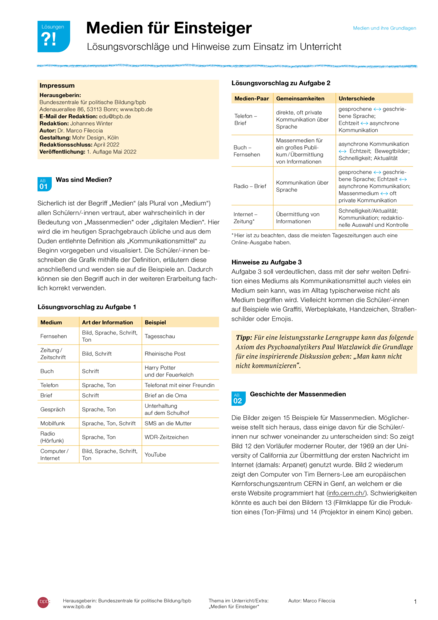 Medien für Einsteiger: Lösungsvorschläge und Hinweise zum Einsatz im Unterricht