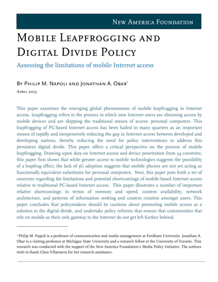 "This paper offers a critical perspective on the process of mobile leapfrogging. Drawing upon data on Internet access and device penetration from 34 countries, this paper first shows that while greater access to mobile technologies suggests the possibility of a leapfrog effect, the lack of 3G adoption suggests that mobile phones are not yet acting as functionally equivalent substitutes for personal computers. Next, this paper puts forth a set of concerns regarding the limitations and potential shortcomings of mobile-based Internet access relative to traditional PC-based Internet access. This paper illustrates a number of important relative shortcomings in terms of memory and speed, content availability, network architecture, and patterns of information seeking and content creation amongst users. This paper concludes that policymakers should be cautious about promoting mobile access as a solution to the digital divide, and undertake policy reforms that ensure that communities that rely on mobile as their only gateway to the Internet do not get left further behind." (Page 1)