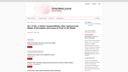 "What are root causes of trust and distrust in media in different political contexts? How is media use shifted from one source to another with the change of political culture? What factors shape media perception across cultures and across political regimes? Are there commonalities or are they different? Given the common instrumentalization of media in conflict environments and the growing ubiquity of political media capture, we may also ask, whether unfettered trust in media is normatively desirable under any circumstances. Put differently: Isn’t distrust a healthy response to propaganda and media manipulation? How is the concept of media literacy connected to trust or media scepticism? Do we need to be more sceptical rather than gullible? Against the backdrop of these (and other) questions, the Forum Media and Development (fome) dedicated its 2021 annual symposium to the question of trust in media, namely the question how media perception is shaped differently by different political contexts and media structures across the globe. Fome is the German platform for international media development initiatives (fome.info), a network that includes 24 organizations working towards strengthening free and independent media in developing and transitioning countries. The 2021 fome-symposium ran under the heading “Believe it or Not! Enquiries about TRUST in media (assistance)” and was organized by MiCT. The proceedings of the conference can be found online at https://fome.info/symposium-2021-documentation. Finally, this themed issue of the Global Media Journal – German Edition is curated as an extension of the conference and an effort to follow up upon some of the most pressing questions deriving from it." (Editorial)