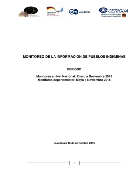 "El número total de notas publicadas en cinco medios escritos fue de 572, cantidad poco relevante si se considera que fueron 51 ejes monitoreados en 11 meses [...] El conteo final reporta que el eje de sucesos fue el que más publicaciones tuvo, con 100. Esto deja claro, como ha sido común en monitoreos departamentales realizados por CERIGUA, que tanto medios nacionales como locales privilegian la información de sucesos, por ser “lo que más vende”. El eje de Mujeres, aunque fue el segundo con más publicaciones, no fue constante; solo en marzo y noviembre tuvo 11 publicaciones, respectivamente; mayo tuvo 8 y julio 5; los demás meses fueron 3 y menos. De los ejes establecidos en este monitoreo no se publicó nada de: Acuerdos de Paz, Minería, Política Agraria, Cosmovisión y Espiritualidad, Reivindicaciones legales, Sequía, Ley de Obtención de Vegetales, Narcoactividad a pesar de la elevada importancia que revisten." (Conclusiones del período analizado: enero a noviembre de 2015, página 156).