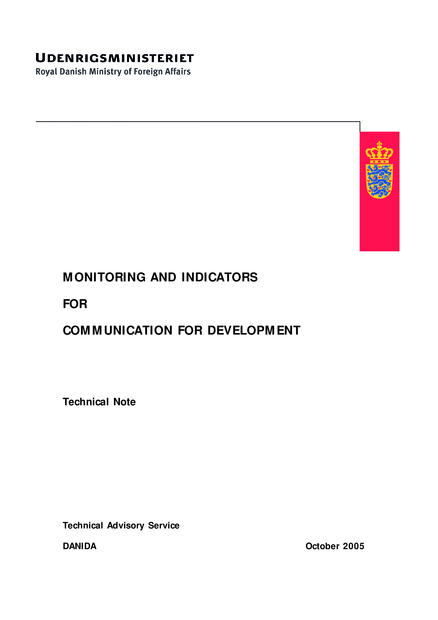 3. Communication Monitoring and Indicators: provides general guidelines for monitoring and indicators on communication for development, and analyses the process of identifying indicators in programmes (1) where communication in itself is a vehicle for social change (media development), and (2) where communication is an integral part of a sector/development program (development communication)." (Page iv)
