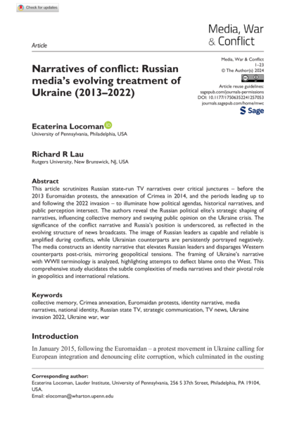 "This article scrutinizes Russian state-run TV narratives over critical junctures – before the 2013 Euromaidan protests, the annexation of Crimea in 2014, and the periods leading up to and following the 2022 invasion – to illuminate how political agendas, historical narratives, and public perception intersect. The authors reveal the Russian political elite’s strategic shaping of narratives, influencing collective memory and swaying public opinion on the Ukraine crisis. The significance of the conflict narrative and Russia’s position is underscored, as reflected in the evolving structure of news broadcasts. The image of Russian leaders as capable and reliable is amplified during conflicts, while Ukrainian counterparts are persistently portrayed negatively. The media constructs an identity narrative that elevates Russian leaders and disparages Western counterparts post-crisis, mirroring geopolitical tensions. The framing of Ukraine’s narrative with WWII terminology is analyzed, highlighting attempts to deflect blame onto the West. This comprehensive study elucidates the subtle complexities of media narratives and their pivotal role in geopolitics and international relations." (Abstract)