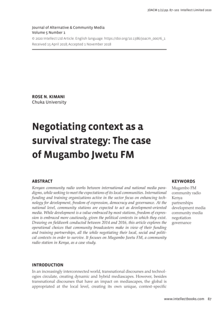 "Kenyan community radio works between international and national media paradigms, while seeking to meet the expectations of its local communities. International funding and training organizations active in the sector focus on enhancing technology for development, freedom of expression, democracy and governance. At the national level, community stations are expected to act as development-oriented media. While development is a value embraced by most stations, freedom of expression is embraced more cautiously, given the political contexts in which they exist. Drawing on fieldwork conducted between 2014 and 2016, this article explores the operational choices that community broadcasters make in view of their funding and training partnerships, all the while negotiating their local, social and political contexts in order to survive. It focuses on Mugambo Jwetu FM, a community radio station in Kenya, as a case study." (Abstract)