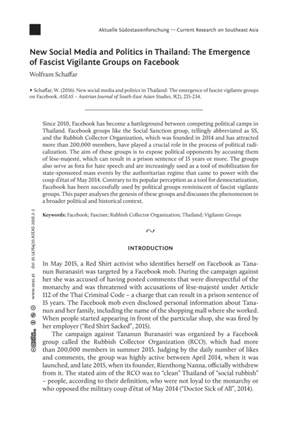"Since 2010, Facebook has become a battleground between competing political camps in Thailand. Facebook groups like the Social Sanction group, tellingly abbreviated as SS, and the Rubbish Collector Organization, which was founded in 2014 and has attracted more than 200,000 members, have played a crucial role in the process of political radicalization. The aim of these groups is to expose political opponents by accusing them of lèse-majesté, which can result in a prison sentence of 15 years or more. The groups also serve as fora for hate speech and are increasingly used as a tool of mobilization for state-sponsored mass events by the authoritarian regime that came to power with the coup d’état of May 2014. Contrary to its popular perception as a tool for democratization, Facebook has been successfully used by political groups reminiscent of fascist vigilante groups. This paper analyses the genesis of these groups and discusses the phenomenon in a broader political and historical context." (Abstract)