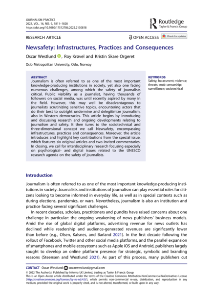 "Journalism is often referred to as one of the most important knowledge-producing institutions in society, yet also one facing numerous challenges, among which the safety of journalists critical. Public visibility as a journalist, having thousands of followers on social media, was until recently aspired by many in the field. However, this may well be disadvantageous to journalists scrutinizing sensitive topics, encountering actors that do their best to outright undermine and delegitimize journalism, also in Western democracies. This article begins by introducing and discussing research and ongoing developments relating to journalism and safety. It then turns to the sociotechnical and three-dimensional concept we call Newsafety, encompassing infrastructures, practices and consequences. Moreover, the article introduces and highlight key contributions from the special issue, which features six original articles and two invited commentaries. In closing, we call for interdisciplinary research focusing especially on psychological- and digital issues related to the UNESCO research agenda on the safety of journalists." (Abstract)