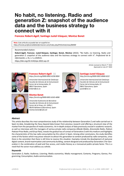 "This article describes the most comprehensive study of the relationship between Generation Z and radio carried out in Spain to date, broadening the focus beyond data known from previous research and offering a structural view of the market from the perspective of media economics. An in-depth analysis of data previously unused in academic research, as well as interviews with the managers of various private radio companies (Ábside Media, Atresmedia Radio, Podium Podcast-Prisa Radio, and Grup Flaix), reveals the gradual loss of contact of Generation Z with this medium and highlights the characteristics of the low radio consumption by this cohort in Spain. Among other conclusions, the study identifies some of the factors which may prove relevant to attract this generation to content produced by radio companies, since there is the conviction that there is still time to reverse this situation. Examples include the development of exclusive digital content, brand maximization and community building, content designed and produced by Generation Z for Generation Z, the combination of paid and free access, and media literacy as a transversal public–private factor. This is a need that the sector must address as a whole." (Abstract)