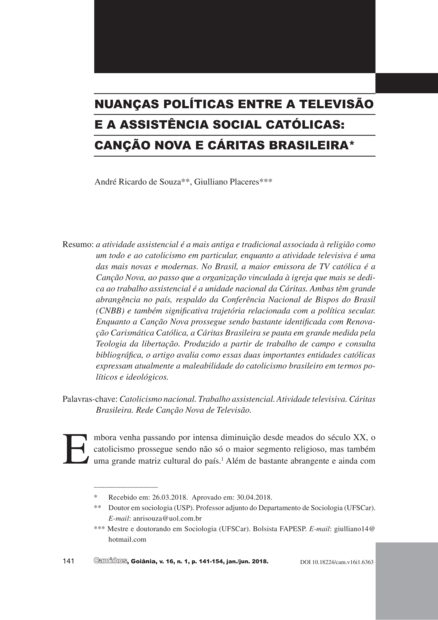 "A atividade assistencial é a mais antiga e tradicional associada à religião como um todo e ao catolicismo em particular, enquanto a atividade televisiva é uma das mais novas e modernas. No Brasil, a maior emissora de TV católica é a Canção Nova, ao passo que a organização vinculada à igreja que mais se dedica ao trabalho assistencial é a unidade nacional da Cáritas. Ambas têm grande abrangência no país, respaldo da Conferência Nacional de Bispos do Brasil (CNBB) e também significativa trajetória relacionada com a política secular. Enquanto a Canção Nova prossegue sendo bastante identificada com Renovação Carismática Católica, a Cáritas Brasileira se pauta em grande medida pela Teologia da libertação. Produzido a partir de trabalho de campo e consulta bibliográfica, o artigo avalia como essas duas importantes entidades católicas expressam atualmente a maleabilidade do catolicismo brasileiro em termos políticos e ideológicos." (Resumo)