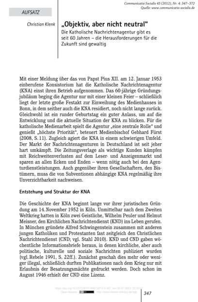 "Im Januar 1953 hat die Katholische Nachrichtenagentur (KNA) ihren Betrieb aufgenommen. Das 60-jährige Gründungsjubiläum ist ein guter Anlass, um auf die Entwicklung und die aktuelle Situation der KNA zu blicken. Die Agentur erreicht mehr als zwei Drittel der Auflage deutscher Tages- und Wochenzeitungen, dazu die wichtigsten Rundfunkredaktionen und die Kirchenpresse. Für die Medienarbeit der katholischen Kirche spielt die KNA darum eine zentrale Rolle. Dennoch sind die Herausforderungen im Jubiläumsjahr gewaltig: Der Markt der Nachrichtenagenturen in Deutschland ist seit jeher umkämpft - die Reichweitenverluste der Zeitungsverlage auf dem Leser- und Anzeigenmarkt wirken sich auf die wirtschaftliche Situation der Agenturen aus. Und gegenüber den Gesellschaftern, den Bistümern, muss die von Subventionen abhängige KNA regelmäßig ihre Unverzichtbarkeit nachweisen." (Abstract)