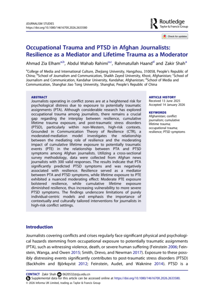 "Journalists operating in conflict zones are at a heightened risk for psychological distress due to exposure to potentially traumatic assignments (PTA). Although considerable research has explored occupational trauma among journalists, there remains a crucial gap regarding the interplay between resilience, cumulative lifetime trauma exposure, and post-traumatic stress disorders (PTSD), particularly within non-Western, high-risk contexts. Grounded in Communication Theory of Resilience (CTR), a moderated-mediation model investigates the relationship between the mediating role of resilience and the moderating impact of cumulative lifetime exposure to potentially traumatic events (PTE) in the relationship between PTA and PTSD symptoms among Afghan journalists. Utilizing a cross-sectional survey methodology, data were collected from Afghan news journalists with 300 valid responses. The results indicate that PTA significantly predicted PTSD symptoms and was negatively associated with resilience. Resilience served as a mediator between PTA and PTSD symptoms, while lifetime exposure to PTE exhibited a nuanced moderating effect: Moderate PTE exposure bolstered resilience, while cumulative lifetime exposure diminished resilience, thus increasing vulnerability to more severe PTSD symptoms. The findings underscore limitations of purely individual-centric models and emphasize the importance of contextually and culturally tailored interventions for journalists in high-risk conflict settings." (Abstract)