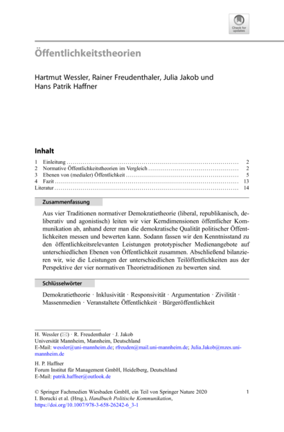 "Aus vier Traditionen normativer Demokratietheorie (liberal, republikanisch, deliberativ und agonistisch) leiten wir vier Kerndimensionen öffentlicher Kommunikation ab, anhand derer man die demokratische Qualität politischer Öffentlichkeiten messen und bewerten kann. Sodann fassen wir den Kenntnisstand zu den öffentlichkeitsrelevanten Leistungen prototypischer Medienangebote auf unterschiedlichen Ebenen von Öffentlichkeit zusammen. Abschließend bilanzieren wir, wie die Leistungen der unterschiedlichen Teilöffentlichkeiten aus der Perspektive der vier normativen Theorietraditionen zu bewerten sind." (Zusammenfassung)