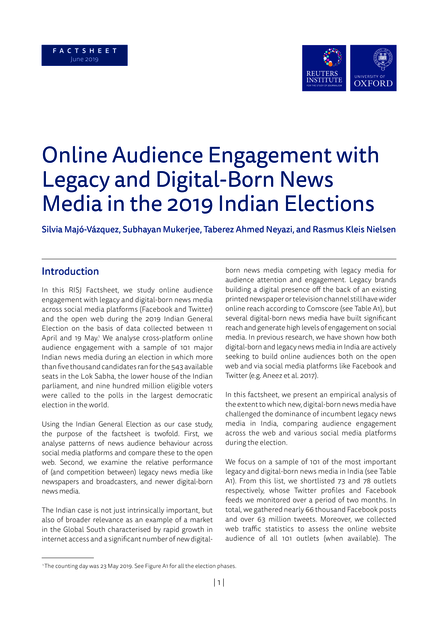 "In this factsheet, we study online audience engagement with legacy and digital-born news media across social media platforms (Facebook and Twitter) and the open web during the 2019 Indian General Election on the basis of data collected between 11 April and 19 May. We analyse cross-platform online audience engagement with a sample of 101 major Indian news media during an election in which more than five thousand candidates ran for the 543 available seats in the Lok Sabha, the lower house of the Indian parliament, and nine hundred million eligible voters were called to the polls in the largest democratic election in the world." (Publisher description)