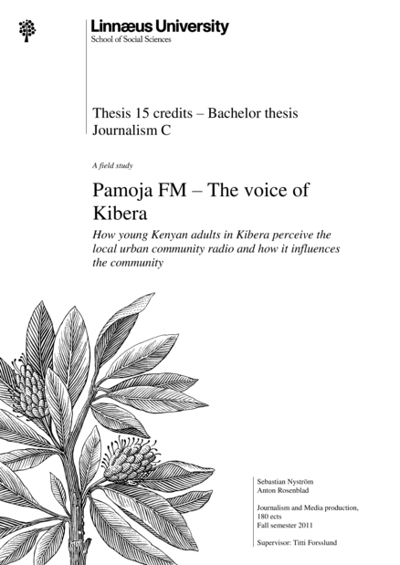 "In Kibera, the biggest slum area in Nairobi and in whole East Africa, the urban slum community radio station Pamoja FM only works for the citizens living within Kibera. We aimed to find out how the youth in Kibera perceive the efficacy of the radio station as a viable source of news and information. We wanted to establish how important this radio station is to them as a tool of empowerment and knowledge to the youth. Through semi-structured interviews with the youth in Kibera we carried out a qualitative research study during ten weeks, from October until December in 2011. We walked the field in Kibera to gather as much data as possible, and our findings were very interesting. Key theories used in this study included the participatory communication model, the media dependency model and the uses and gratifications model. The findings indicated that Pamoja FM has a great influence in the community as it is considered the most important source for news and information for the youth in this slum, and provides a platform that meets their needs as active participating audiences to the content supplied by the radio station. The radio is accredited to have changed the citizens´ way of thinking about tribalism since the post-election violence in 2007; the young women have assertively declared their space by playing a more proactive role in the community and audiences are empowered with home-grown problem solving skills that have bettered their lives and in pursuit for peace." (Abstract)