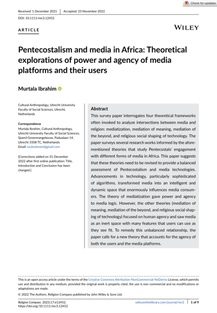 "This survey paper interrogates four theoretical frameworks often invoked to analyze intersections between media and religion: mediatization, mediation of meaning, mediation of the beyond, and religious social shaping of technology. The paper surveys several research works informed by the aforementioned theories that study Pentecostals' engagement with different forms of media in Africa. This paper suggests that these theories need to be revised to provide a balanced assessment of Pentecostalism and media technologies. Advancements in technology, particularly sophisticated of algorithms, transformed media into an intelligent and dynamic space that enormously influences media consumers. The theory of mediatization gave power and agency to media logic. However, the other theories (mediation of meaning, mediation of the beyond, and religious social shaping of technology) focused on human agency and saw media as an inert space with many features that users can use as they see fit. To remedy this unbalanced relationship, the paper calls for a new theory that accounts for the agency of both the users and the media platforms." (Abstract)