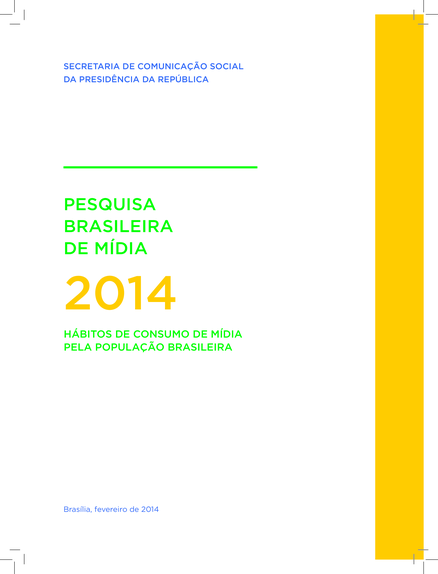 "A primeira edição da “Pesquisa Brasileira de Mídia” traz um retrato representativo e preciso sobre o uso que os brasileiros declaram fazer, atualmente, dos meios de comunicação social. Continua sendo predominante a presença da TV nos lares do País, apesar do rápido crescimento da internet. Nada menos que 97% dos entrevistados afirmaram ver TV, um hábito que une praticamente todos os brasileiros, com independência de gênero, idade, renda, nível educacional ou localização geográfica. A internet e o rádio são meios de comunicação também muito presentes na vida das pessoas, ainda que em menor grau: 61% têm o costume de ouvir rádio e 47% têm o hábito de acessar a internet. Já a leitura de jornais e revistas impressos é menos frequente e alcança, respectivamente, 25% e 15% dos entrevistados." (Pág. 7)