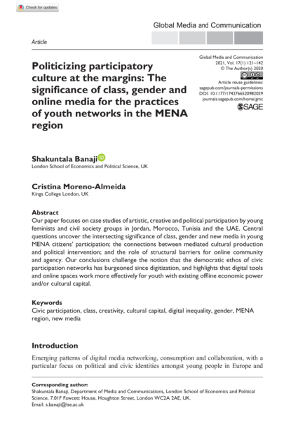 "Our paper focuses on case studies of artistic, creative and political participation by young feminists and civil society groups in Jordan, Morocco, Tunisia and the UAE. Central questions uncover the intersecting significance of class, gender and new media in young MENA citizens’ participation; the connections between mediated cultural production and political intervention; and the role of structural barriers for online community and agency. Our conclusions challenge the notion that the democratic ethos of civic participation networks has burgeoned since digitization, and highlights that digital tools and online spaces work more effectively for youth with existing offline economic power and/or cultural capital." (Abstract)