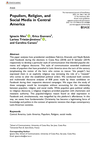 "This paper analyzes how presidential candidates Fabricio Alvarado and Nayib Bukele used Facebook during the elections in Costa Rica (2018) and El Salvador (2019) respectively to develop a particular style of communication that blended populist elements and religious discourse. This style of communication extended traditional modes of populism that have prevailed in Latin America since the turn of the century (emphasizing the notion of the hero who comes to rescue “the people”) but expressed them in an explicitly religious way (stressing the role of a “messiah” who comes to alter the established political order). We conducted both content and multimodal discourse analyses of 838 posts made by these candidates on Facebook during their respective electoral campaigns. We argue that the study of these campaigns would be incomplete without accounting for the relationship between populism, religion, and social media. While populism gave political validity to religious discourse, a religious imaginary provided populism with charismatic and messianic authority. This populist/religious reason found an ideal expression in Facebook and, simultaneously, was resignified by this platform’s affordances. In this way, we assess how fundamentalist Christianity has become a legitimating force of knowledge and politics in the context of epistemic tensions that shape contemporary Latin-American societies." (Abstract)