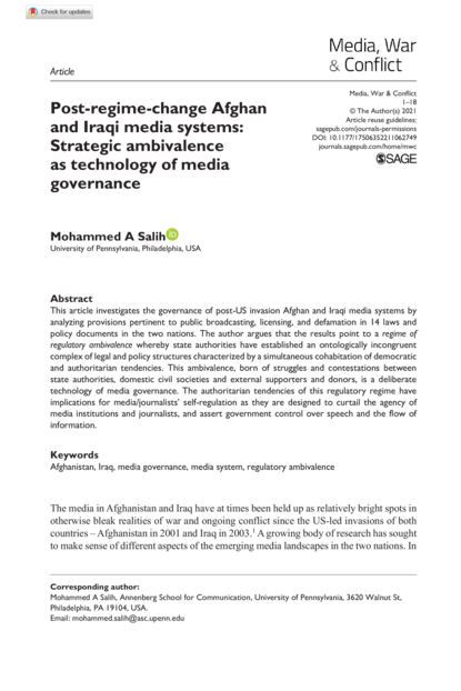 "This article investigates the governance of post-US invasion Afghan and Iraqi media systems by analyzing provisions pertinent to public broadcasting, licensing, and defamation in 14 laws and policy documents in the two nations. The author argues that the results point to a regime of regulatory ambivalence whereby state authorities have established an ontologically incongruent complex of legal and policy structures characterized by a simultaneous cohabitation of democratic and authoritarian tendencies. This ambivalence, born of struggles and contestations between state authorities, domestic civil societies and external supporters and donors, is a deliberate technology of media governance. The authoritarian tendencies of this regulatory regime have implications for media/journalists’ self-regulation as they are designed to curtail the agency of media institutions and journalists, and assert government control over speech and the flow of information." (Abstract)