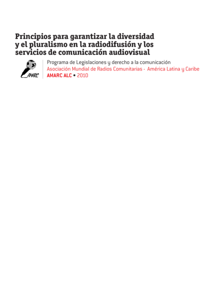"Este documento expone cuarenta principios con la identificación de las fuentes de doctrina y jurisprudencia comparada con el fin de establecer pautas para la radiodifusión pública, comercial y comunitaria, en el contexto regional actual. Consideramos que este trabajo es un aporte frente a la escasez de bibliografía y desarrollo doctrinario en esta materia en América Latina, sistematizando la jurisprudencia regional e internacional con el fin de generar una base para la definición e implementación de políticas de radiodifusión tendientes a la promoción de la diversidad y el pluralismo." (Preámbulo)