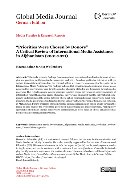 "This study presents findings from research on international media development strate-gies and practices in Afghanistan between 2001 and 2021. Based on qualitative interviews with 35 Afghan journalists in Afghanistan, the research offers a retroactive assessment of key patterns in International Media Assistance. The findings indicate that prevailing media assistance strategies, as perceived by interviewees, were largely aimed at changing attitudes and behaviors through media programs. This reflects a media-centric paradigm in which people are viewed as passive recipients of information rather than active agents of change. Interviewees also noted that the international com-munity underestimated the divide between liberal urban communities and conservative rural com-munities. Media programs often targeted liberal, urban youth, further jeopardizing social cohesion in Afghanistan. Future programs should prioritize citizen engagement in public affairs through the media to help counter the widespread perception that decisions are made elsewhere. Participatory approaches should also include conservative communities, as a sole focus on liberal urban elites has been seen as deepening social divisions." (Abstract)