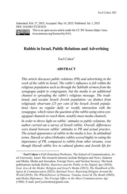 "This article discusses public relations (PR) and advertising in the work of the rabbi in Israel. The rabbi's influence is felt within the religious population such as through the Sabbath sermon from the synagogue pulpit to congregants, but the media is an additional channel to spreading the rabbi's religious message. The traditional, and secular Israeli Jewish population-as distinct from religiously observant (25 per cent of the Israeli Jewish population)-have no regular daily or weekly interaction with the synagogue, which raises the question of the rabbis using extra-synagogual channels to reach them, notably mass media channels. In order to throw light on rabbis' attitudes to public relations, the author carried out a survey of Israeli rabbis. Overall, differences were found between rabbis' attitudes to PR and actual practice. The actual appearance of rabbis in the media is less. In attitudinal terms, Haredi or ultra-Orthodox rabbis scored highly in rating the importance of PR, compared to rabbis from other streams, even though Haredi rabbis live in cultural ghettos and Jewish life for them is focused on the synagogue and Torah learning. Reaching beyond the pulpit was also important for the more intensive substream of modern orthodoxy, "Hardal". By corollary, it was surprising that PR among the non-Orthodox rabbis-notwithstanding that their arena of religious outreach was secular Israel-was rated lower." (Abstract)