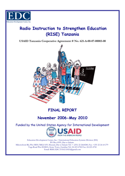 "The Radio Instruction to Strengthen Education (RISE) in Tanzania project exceeded its targets and deliverables in every aspect of the project: More primary and secondary beneficiaries were reached, more trainings were conducted, and more resources and equipment were distributed than estimated. These figures are principally due to the commitment of the RISE team and the level of the confidence in the program by national institutions (Ministries of Education and Vocational Training and the Tanzania Institute of Education), district officials, schools and local populations [...] RISE built capacity of communities, districts and national institutions for the establishment and maintenance of 180 Tucheze Tujifunze (TuTu) centers in two districts in Zanzibar and 95 Mambo Elimu Community Learning Centers (MECLC) in seven districts in Mainland Tanzania. In addition, RISE reached 246 classrooms in Zanzibar. RISE produced and distributed resources: Interactive Radio Instruction (IRI) programs, Interactive Video Instruction (IVI) programs, guides, classroom kits and song and story books. In addtion, RISE distributed user friendly and sustainable equipment (solar radios, MP3s and MP4s) for audio and video training and in-class support, and trained local staff in their care, use and operation. RISE conducted trainings for education mentors, teachers, shehas, head teachers, school management committees, teacher center staff, district officials and district coordinators. It also built the capacity of MoEVT employees in the design, development and production of IRI and IVI programming, printed materials and training programs." (Executive summary)