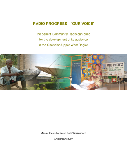 "Some recommendations can be made to Radio Progress and its community. The station seems to provide the Upper West people with what they needed – a voice to make themselves heard and to communicate with each other. Since the research showed that most limitations are due to the restraints in financial stability some stronger effort to receive funding would be advisable. Without undermining the non-profit character, Radio Progress could put more emphasise on some fundraising activities. More financial flexibility could solve most of the limitations the station is facing. Furthermore, the station board should pay more attention to a stable coordination of the station. The formerly absent and recently not existing coordination might bear negative impact on the staff motivation. Moreover, this rather unorganised coordination possibly restricts a consequent performance and a stringent development of the programming as well as potential improvement strategies. Some advice can be addressed to the listening communities. The research showed how vital the listeners handle information and educative input they receive through the station and as such also from other villages. By internal clustering of information and output through internal reflection they could even intensify the mutual learning effect the programming offers. Communities could form a committee to which people can address their grievances, demands and ideas on a frequent basis and which could present these collected information to the station. Such an organised information collection and transfer could overcome a crucial obstacle to participate for many people - the restriction to call or visit the station on their own." (Recommendations, page 98)