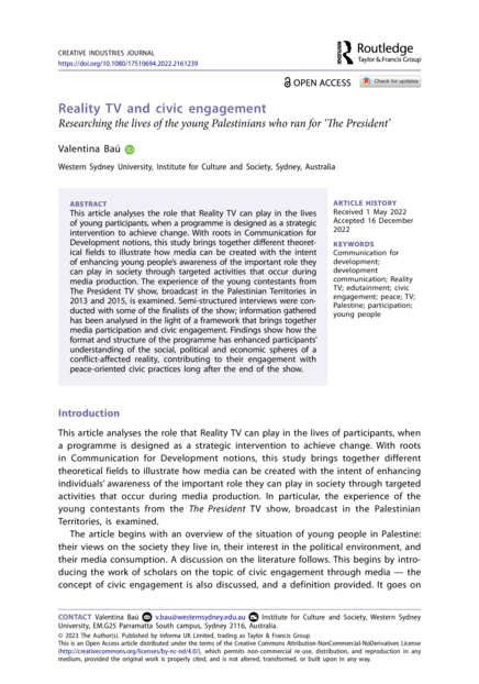 "This article analyses the role that Reality TV can play in the lives of young participants, when a programme is designed as a strategic intervention to achieve change. With roots in Communication for Development notions, this study brings together different theoretical fields to illustrate how media can be created with the intent of enhancing young people’s awareness of the important role they can play in society through targeted activities that occur during media production. The experience of the young contestants from The President TV show, broadcast in the Palestinian Territories in 2013 and 2015, is examined. Semi-structured interviews were conducted with some of the finalists of the show; information gathered has been analysed in the light of a framework that brings together media participation and civic engagement. Findings show how the format and structure of the programme has enhanced participants’ understanding of the social, political and economic spheres of a conflict-affected reality, contributing to their engagement with peace-oriented civic practices long after the end of the show." (Abstract)
