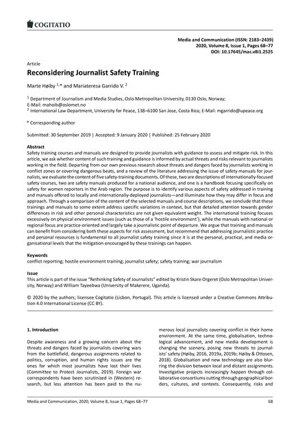 "Safety training courses and manuals are designed to provide journalists with guidance to assess and mitigate risk. In this article, we ask whether content of such training and guidance is informed by actual threats and risks relevant to journalists working in the field. Departing from our own previous research about threats and dangers faced by journalists working in conflict zones or covering dangerous beats, and a review of the literature addressing the issue of safety manuals for journalists, we evaluate the content of five safety-training documents. Of these, two are descriptions of internationally-focused safety courses, two are safety manuals produced for a national audience, and one is a handbook focusing specifically on safety for women reporters in the Arab region. The purpose is to identify various aspects of safety addressed in training and manuals offered to locally and internationally-deployed journalists-and illuminate how they may differ in focus and approach. Through a comparison of the content of the selected manuals and course descriptions, we conclude that these trainings and manuals to some extent address specific variations in context, but that detailed attention towards gender differences in risk and other personal characteristics are not given equivalent weight. The international training focuses excessively on physical environment issues (such as those of a 'hostile environment'), while the manuals with national or regional focus are practice-oriented and largely take a journalistic point of departure. We argue that training and manuals can benefit from considering both these aspects for risk assessment, but recommend that addressing journalistic practice and personal resources is fundamental to all journalist safety training since it is at the personal, practical, and media organisational levels that the mitigation encouraged by these trainings can happen." (Abstract)