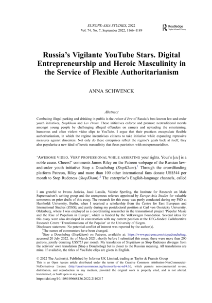 "Combating illegal parking and drinking in public is the raison d’être of Russia’s best-known law-and-order youth initiatives, StopKham and Lev Protiv. These initiatives enforce and promote neotraditional morals amongst young people by challenging alleged offenders on camera and uploading the entertaining, humorous and often violent video clips to YouTube. I argue that their practices encapsulate flexible authoritarianism, in which the regime incentivises citizens to take initiative while expanding repressive measures against dissenters. Not only do these enterprises reflect the regime’s goals back at itself, they also popularise a new ideal of heroic masculinity that fuses patriotism with entrepreneurialism." (Abstract)