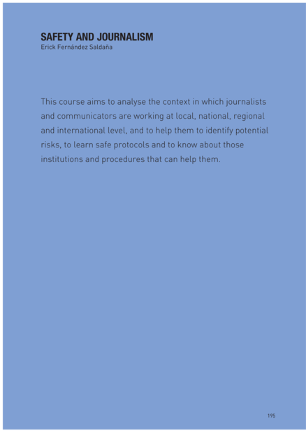 "This course aims to analyse the context in which journalists and communicators are working at local, national, regional and international level, and to help them to identify potential risks, to learn safe protocols and to know about those institutions and procedures that can help them." (Abstract)