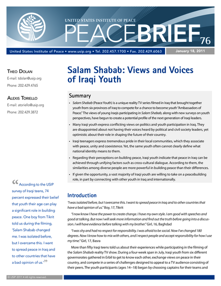 "Salam Shabab (Peace Youth) is a unique reality TV series filmed in Iraq that brought together youth from six provinces of Iraq to compete for a chance to become youth “Ambassadors of Peace.” The views of young Iraqis participating in Salam Shabab, along with new surveys on youth perspectives, have begun to create a potential profile of the next generation of Iraqi leaders. Many Iraqi youth express conflicting views on politics and youth participation in Iraq. They are disappointed about not having their voices heard by political and civil society leaders, yet optimistic about their role in shaping the future of their country. Iraqi teenagers express tremendous pride in their local communities, which they associate with peace, unity and coexistence. Yet, the same youth often cannot clearly define what national identity means to them." (Abstract)