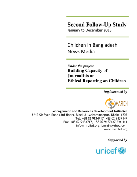 "This report analyses the findings of a follow-up survey of child-related news contents, in newspapers with an aim to assess the coverage trend and its ethical standards. The survey monitored 10 national-level mainstream dailies over a year (January 2013 to December 2013). A secondary set of data from the arena of general news was analysed in order to explore the impacts of inappropriate news content on children. An introduction to the ethical concerns of news coverage in the context of children is provided. This follow-up content analysis takes into account the findings of previous two studies on the same subject. One was a baseline study monitoring media over three consecutive months in 2009. And the other, a follow-up study, covered six fortnights spread across a year (June 2010 to May 2011). This exercise began on the premise that journalists can play a strong role in ensuring the wellbeing of children and in minimising any potential harm to them from news consumption. The comprehensive trend finds a lack of planned focus and consequently, insufficient news coverage of children and their interests or affairs to be a key problem. Dominance of surface coverage of events and issues, inadequacies of reportorial enterprise and a dearth of in-depth coverage appear to be major problems. Insensitivity to the issues of portrayal and dignity, lack of thought to the safety and security of children in sensitive situations, and inconsideration of potential negative impacts of gruesome depictions on child consumers of news could also be noted in the general trend of coverage. However, between 2009 and 2013, a few positive changes can be traced even if disjointedly and sporadically." (Abstract)