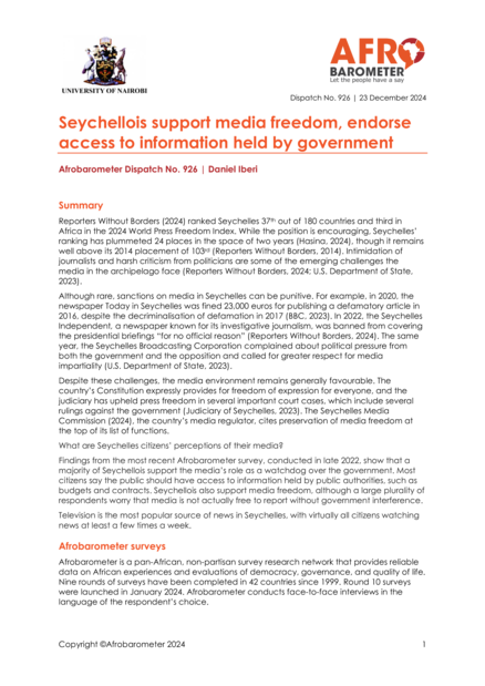 "What are Seychelles citizens’ perceptions of their media? Findings from the most recent Afrobarometer survey, conducted in late 2022, show that a majority of Seychellois support the media’s role as a watchdog over the government. Most citizens say the public should have access to information held by public authorities, such as budgets and contracts. Seychellois also support media freedom, although a large plurality of respondents worry that media is not actually free to report without government interference. Television is the most popular source of news in Seychelles, with virtually all citizens watching news at least a few times a week." (Summary)