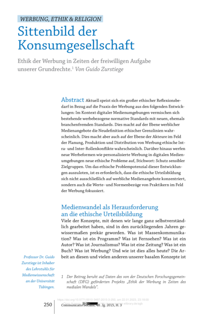"Im Kontext digitaler Medienumgebungen vermischen sich bestehende werbebezogene normative Standards mit neuen, ehemals branchenfremden Standards. Dies macht auf der Ebene werblicher Medienangebote die Neudefinition ethischer Grenzlinien wahrscheinlich. Dies macht aber auch auf der Ebene der Akteure im Feld der Planung, Produktion und Distribution von Werbung ethische Intra und Inter-Rollenkonflikte wahrscheinlich. Darüber hinaus werfen neue Werbeformen wie personalisierte Werbung in digitalen Medienumgebungen neue ethische Probleme auf, Stichwort: Schutz sensibler Zielgruppen. Um das ethische Problempotenzial dieser Entwicklungen auszuloten, ist es erforderlich, dass die ethische Urteilsbildung sich nicht ausschließlich auf werbliche Medienangebote konzentriert, sondern auch die Werte- und Normenbezüge von Praktikern im Feld der Werbung fokussiert." (Abstract)