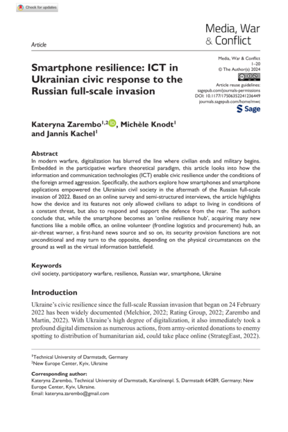 "In modern warfare, digitalization has blurred the line where civilian ends and military begins. Embedded in the participative warfare theoretical paradigm, this article looks into how the information and communication technologies (ICT) enable civic resilience under the conditions of the foreign armed aggression. Specifically, the authors explore how smartphones and smartphone applications empowered the Ukrainian civil society in the aftermath of the Russian full-scale invasion of 2022. Based on an online survey and semi-structured interviews, the article highlights how the device and its features not only allowed civilians to adapt to living in conditions of