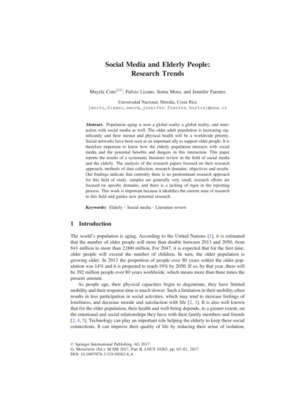 "This paper reports the result of a systematic literature review in the field of social media and the elderly. Our study included 36 research papers, selected after an iterative process. Elders are the fastest growing population around the world and any effort oriented to improve their quality of life is important. Our findings show that there is currently no predominant research approach to address this field of study. Samples were generally small and questionnaires were the most common method of data collection. Many of the research efforts are focused on aspects of design, the interaction of the elderly with social media and how it affects their lives. An interesting aspect we found was an informal approach to report results. Many papers do not define social media and an important number do not indicate the research approach nor the number of participants. Another difficulty is to clearly define who is an older adult." (Conclusion, page 77)