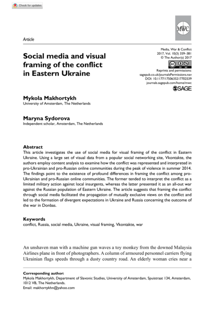 "This article investigates the use of social media for visual framing of the conflict in Eastern Ukraine. Using a large set of visual data from a popular social networking site, Vkontakte, the authors employ content analysis to examine how the conflict was represented and interpreted in pro-Ukrainian and pro-Russian online communities during the peak of violence in summer 2014. The findings point to the existence of profound differences in framing the conflict among pro-Ukrainian and pro-Russian online communities. The former tended to interpret the conflict as a limited military action against local insurgents, whereas the latter presented it as an all-out war against the Russian population of Eastern Ukraine. The article suggests that framing the conflict through social media facilitated the propagation of mutually exclusive views on the conflict and led to the formation of divergent expectations in Ukraine and Russia concerning the outcome of the war in Donbas." (Abstract)